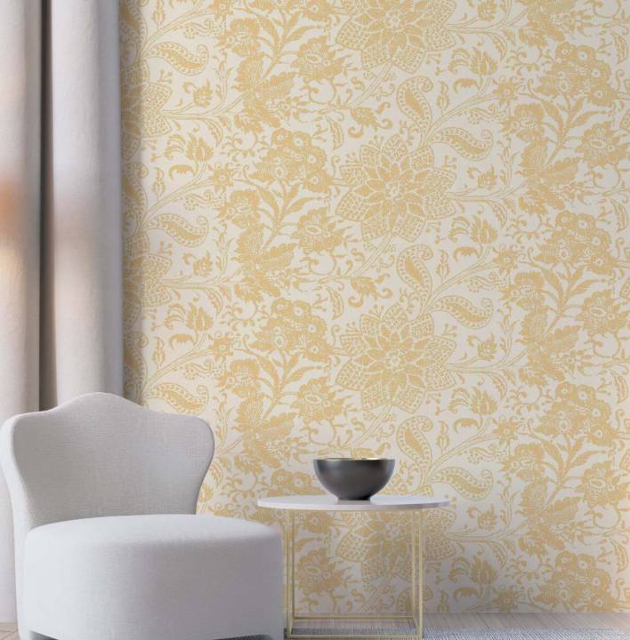 A timeless floral design in a rich golden tone, set against a soft beige backdrop. This wallpaper adds warmth and classic elegance to living rooms, hallways, or formal areas. The ornate pattern blends old-world charm with a cozy, welcoming feel.
