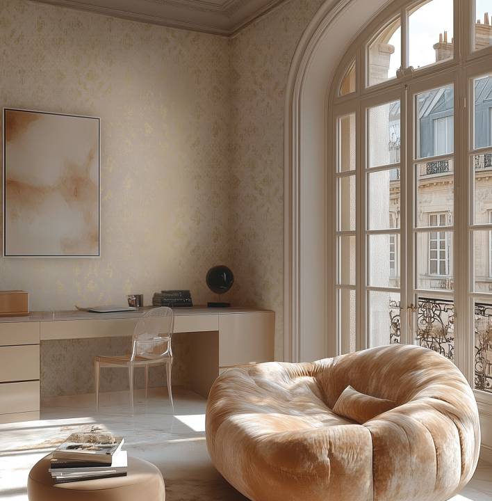 This wallpaper features a soft ivory base adorned with delicate golden damask-style motifs and faded trellis grids. Perfect for dining rooms, foyers, or elegant living spaces, it brings a subtle vintage character with a bright, breathable feel. The light sheen adds warmth without overwhelming the décor.