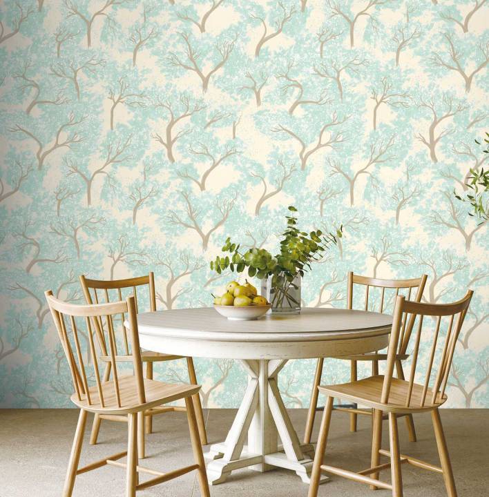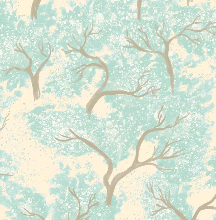 This wallpaper features bare tree branches sketched over a soft blue and cream splash-textured background. It evokes a gentle winter forest feel, making it perfect for kids’ rooms, reading nooks, or playful corners. The hand-painted look adds charm and imagination to any setting.