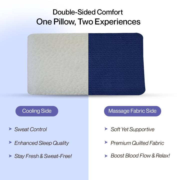 Experience comfort like never before with our Cool Pillow – designed for deep, refreshing sleep. One side features an ultra-cool white fabric that stays chilly to the touch, perfect for hot nights. Flip it over to enjoy the soft blue massager fabric that relaxes your head and neck. Inside is supportive memory foam that adapts to your sleeping posture, giving just the right balance of softness and support. Ideal for all sleep positions and great for both adults and kids.