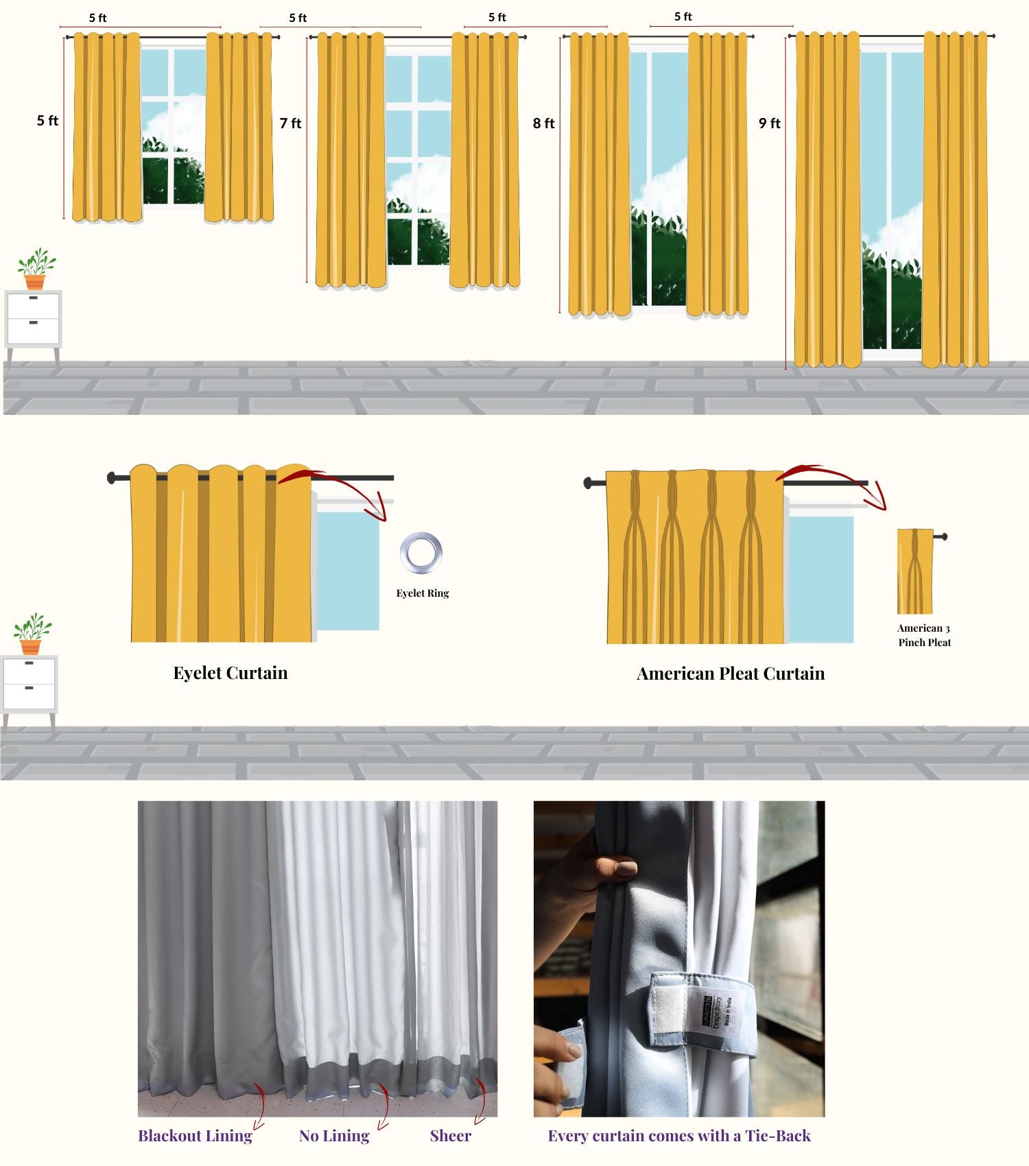 Before making any decisions, accurately measure your windows. Different window lengths require different curtain lengths. Here's a breakdown of the height variants, the first value is the width and the second value is height
