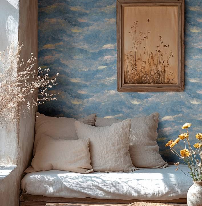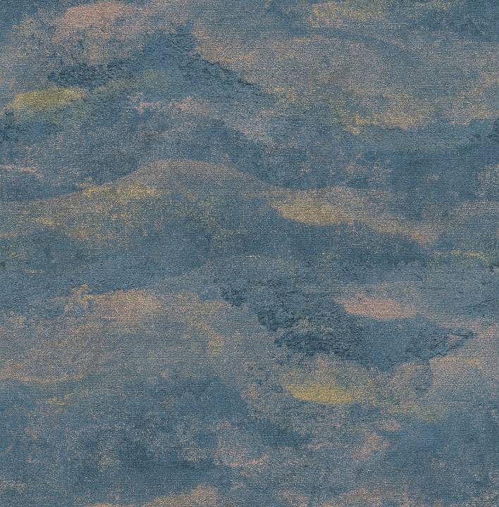 This wallpaper resembles soft brushstrokes of dusk skies—deep blue with wisps of pink, mustard, and slate. The hand-painted effect adds depth and motion, perfect for bedrooms, creative corners, or stylish living rooms. It brings an artistic and calming feel without overpowering the space.