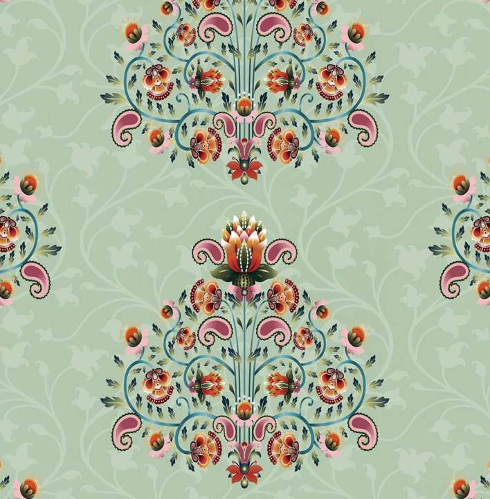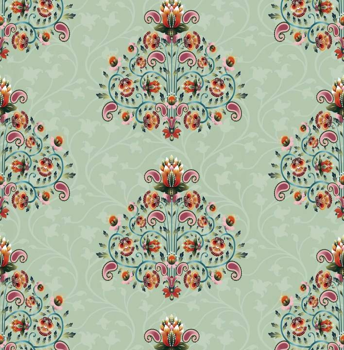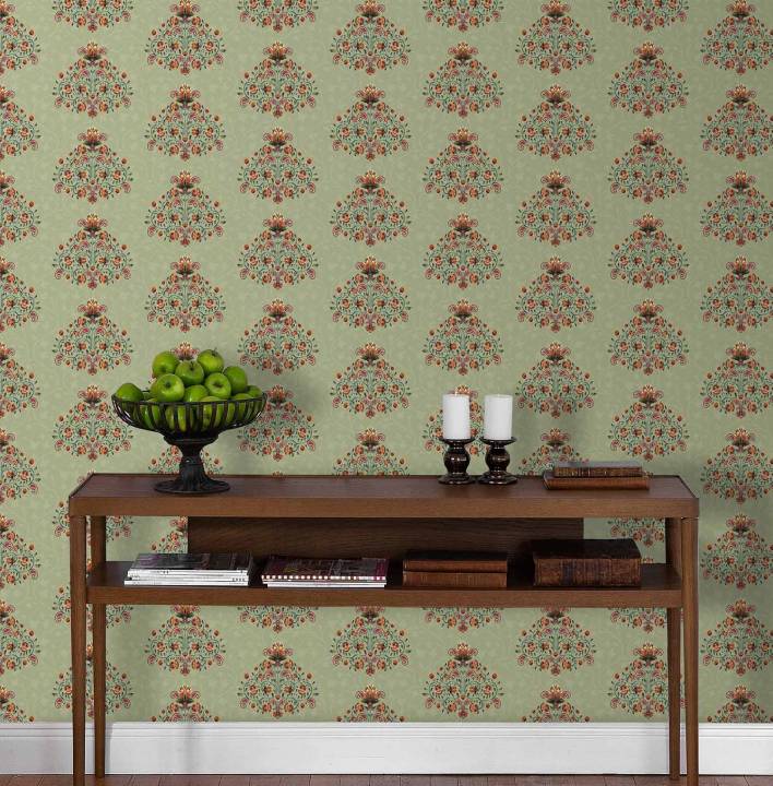 With blooming buta motifs rising like little trees of life, this wallpaper evokes tradition with a breath of elegance. The sage green base soothes the eye, while coral and maroon accents offer richness. Ideal for drawing rooms, passageways, or cozy reading nooks.