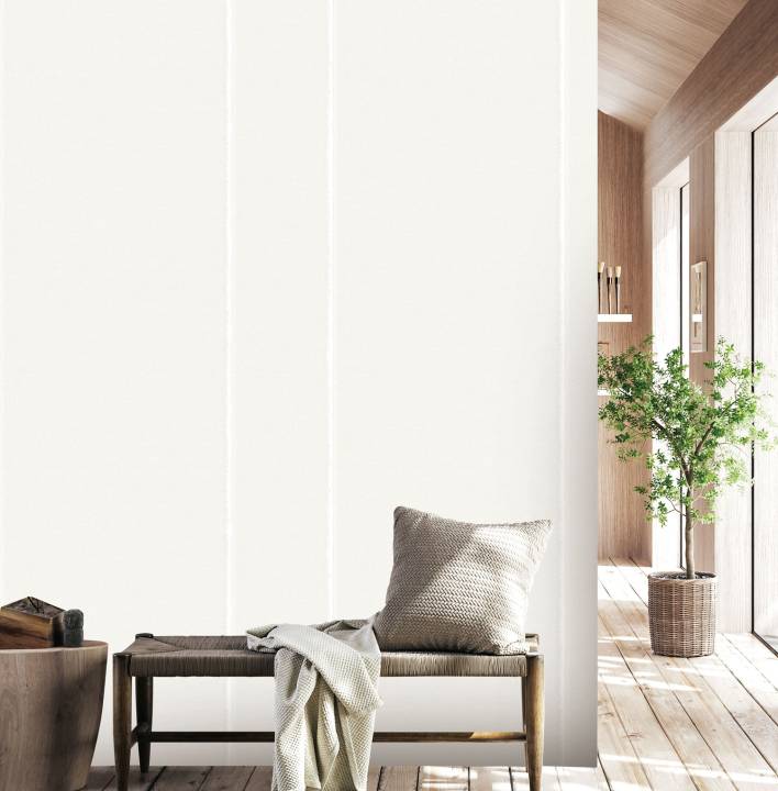 A soft white wallpaper with subtle vertical stripes and a linen-like texture that adds refined simplicity to any space. Ideal for living rooms, bedrooms, or offices where calm, clean lines and quiet sophistication are desired.